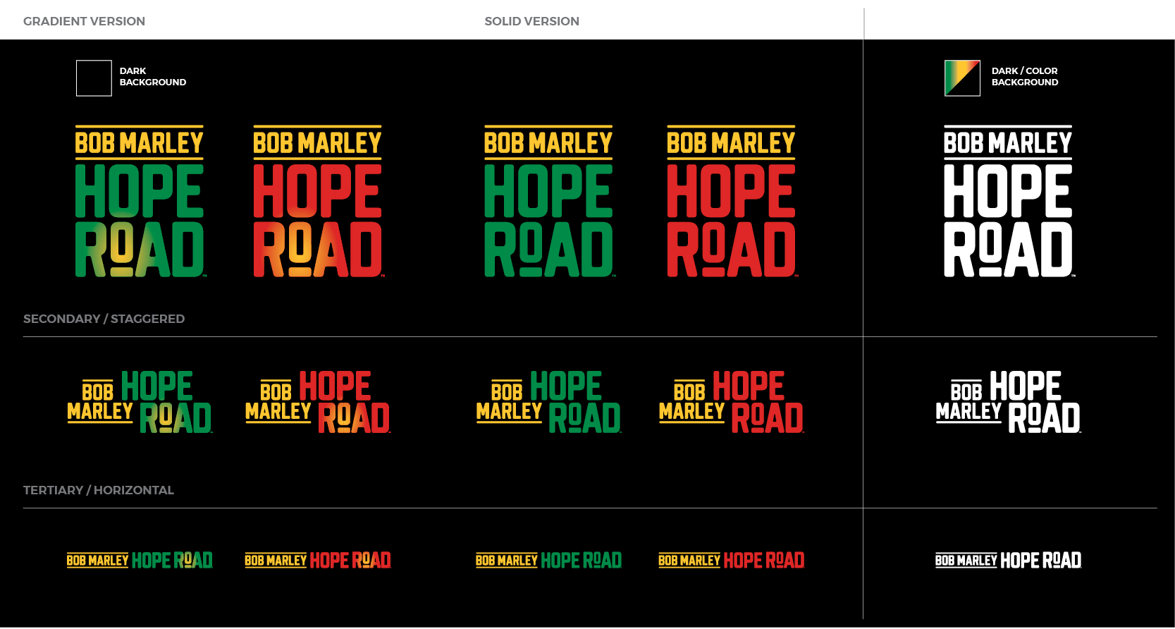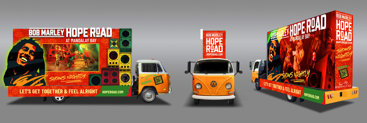 We helped turn the Bob Marley Hope Road experience into a cohesive, high-impact brand by crafting a visual identity that runs through everything—from the logo and color palette to show graphics, on-site signage, retail and merch, vehicle wraps, coordinated digital and print campaigns, and photography. Every touchpoint is designed to feel connected, welcoming, and unmistakably part of the same story.