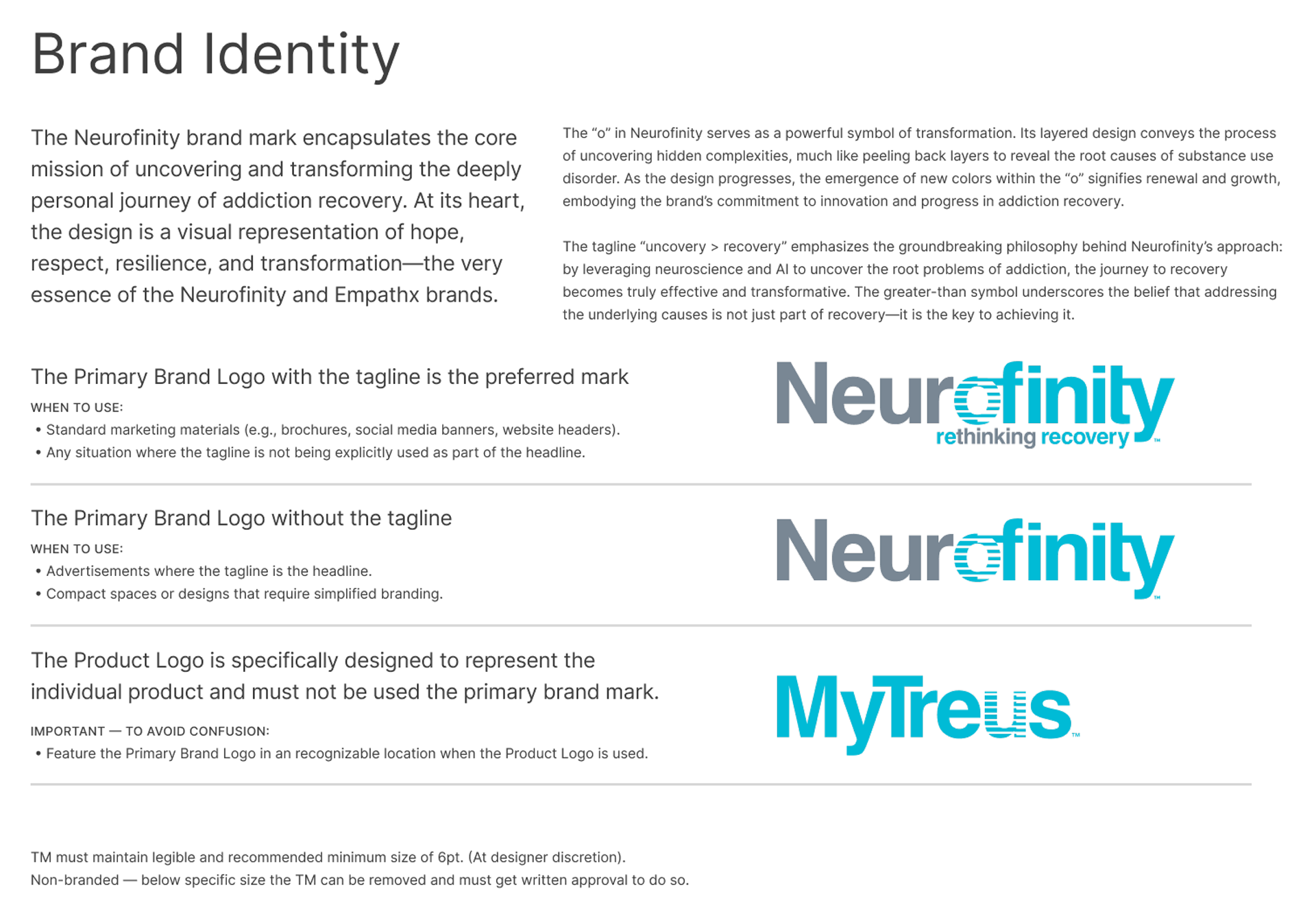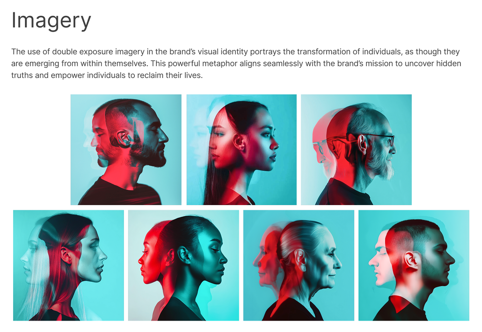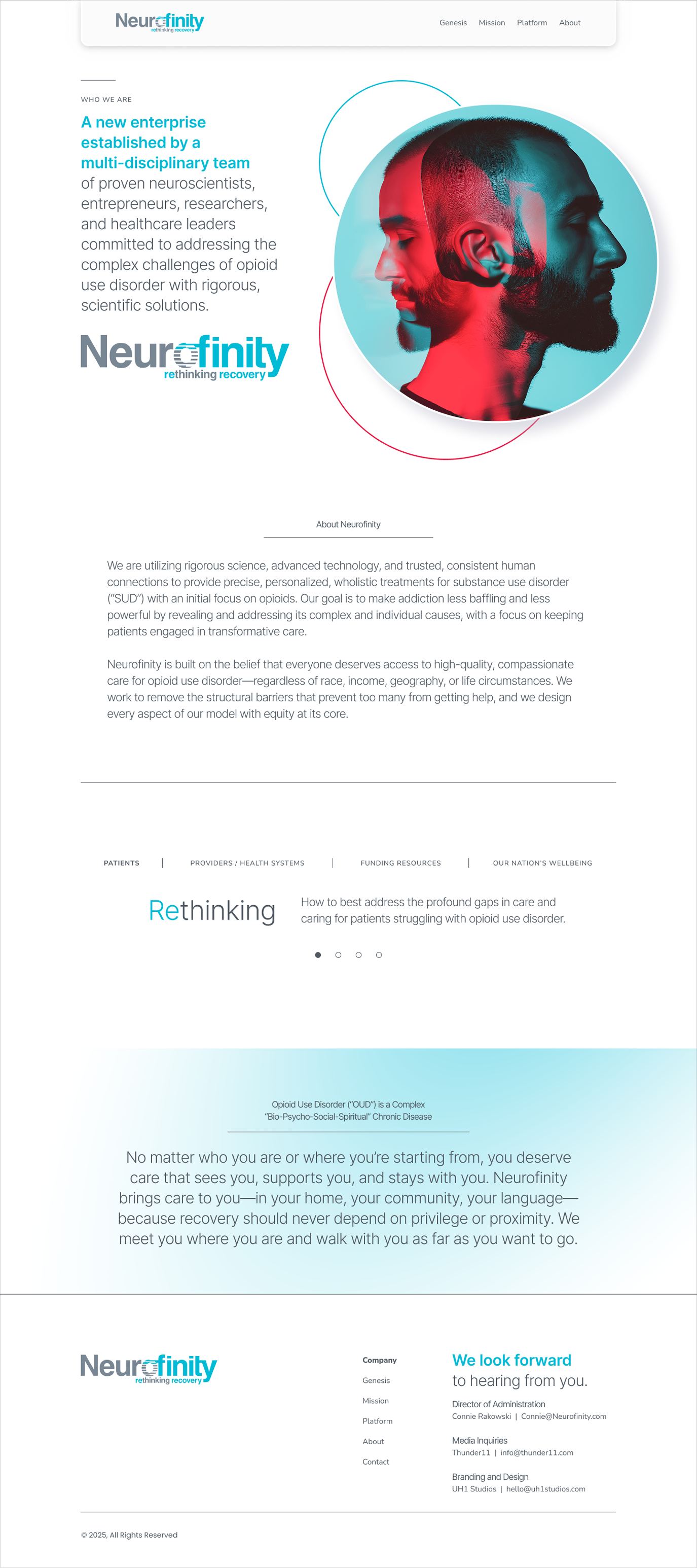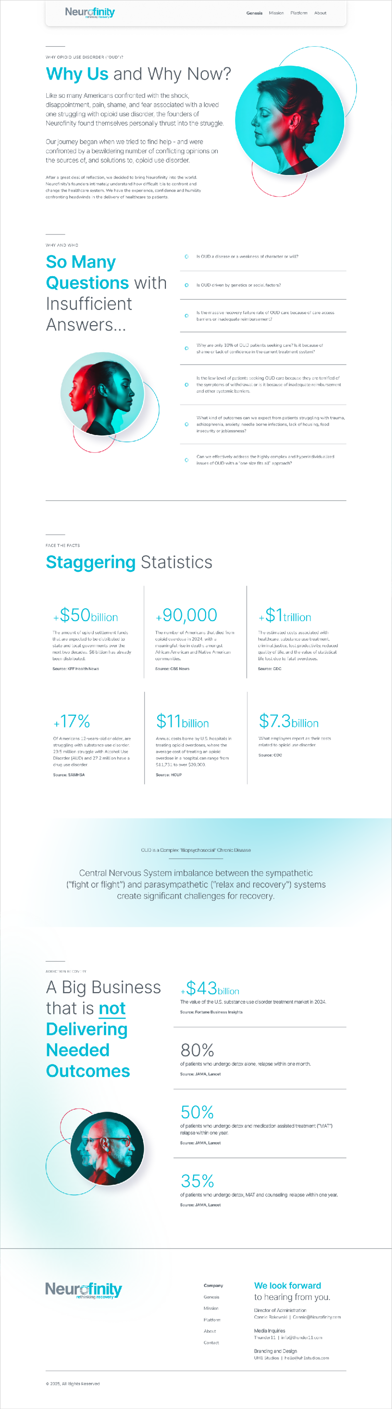For Neurofinity, a company rethinking addiction recovery with neuroscience and AI, we created a visual identity that balances science and hope. Calming gray and blue tones evoke trust, while a subtle color shift hints at growth and renewal. Double exposure imagery serves as the core visual metaphor, depicting individuals emerging stronger and more resilient. Paired with clear, approachable language, the visual system gives Neurofinity a distinctive, emotionally resonant brand that feels scientifically grounded and warmly human.